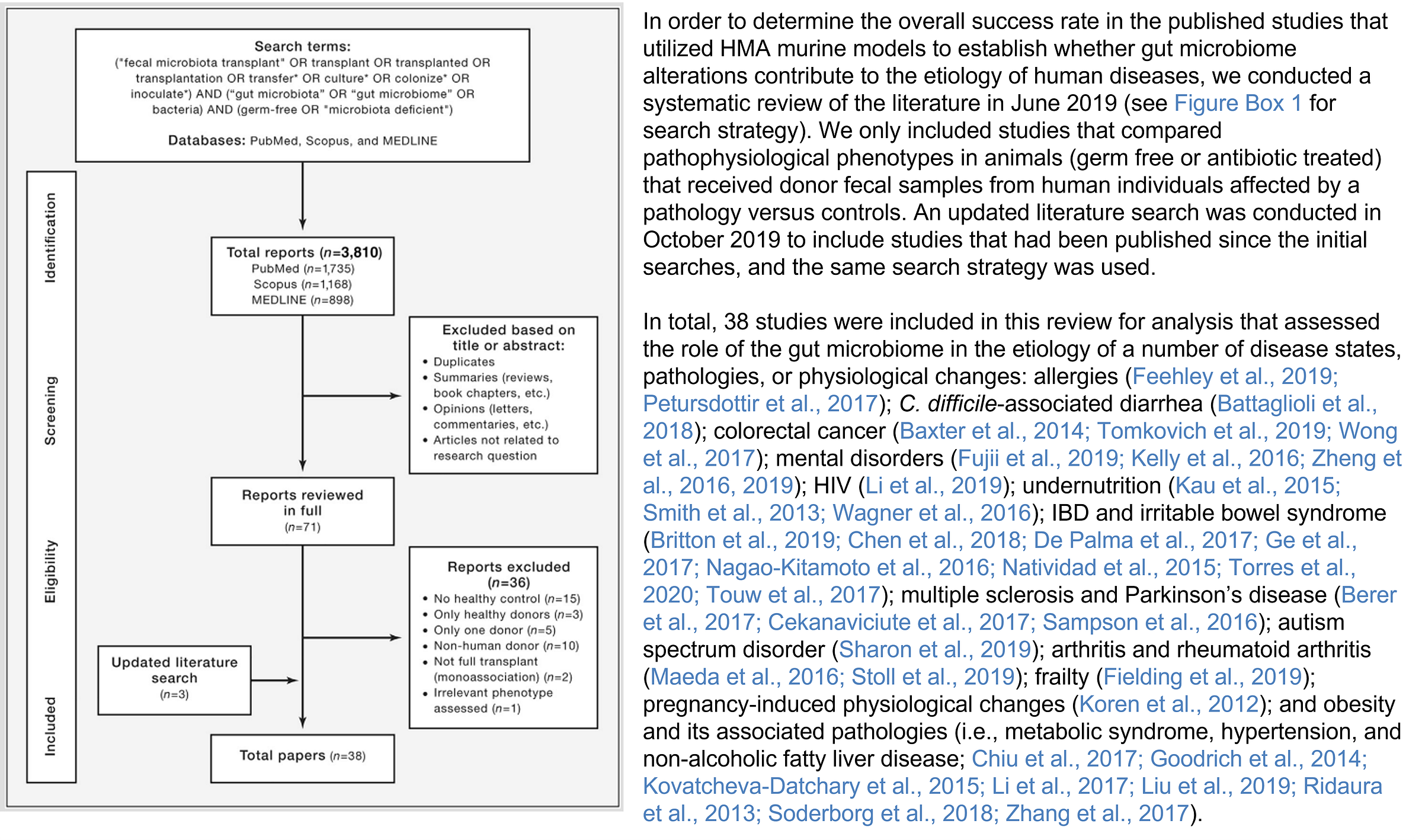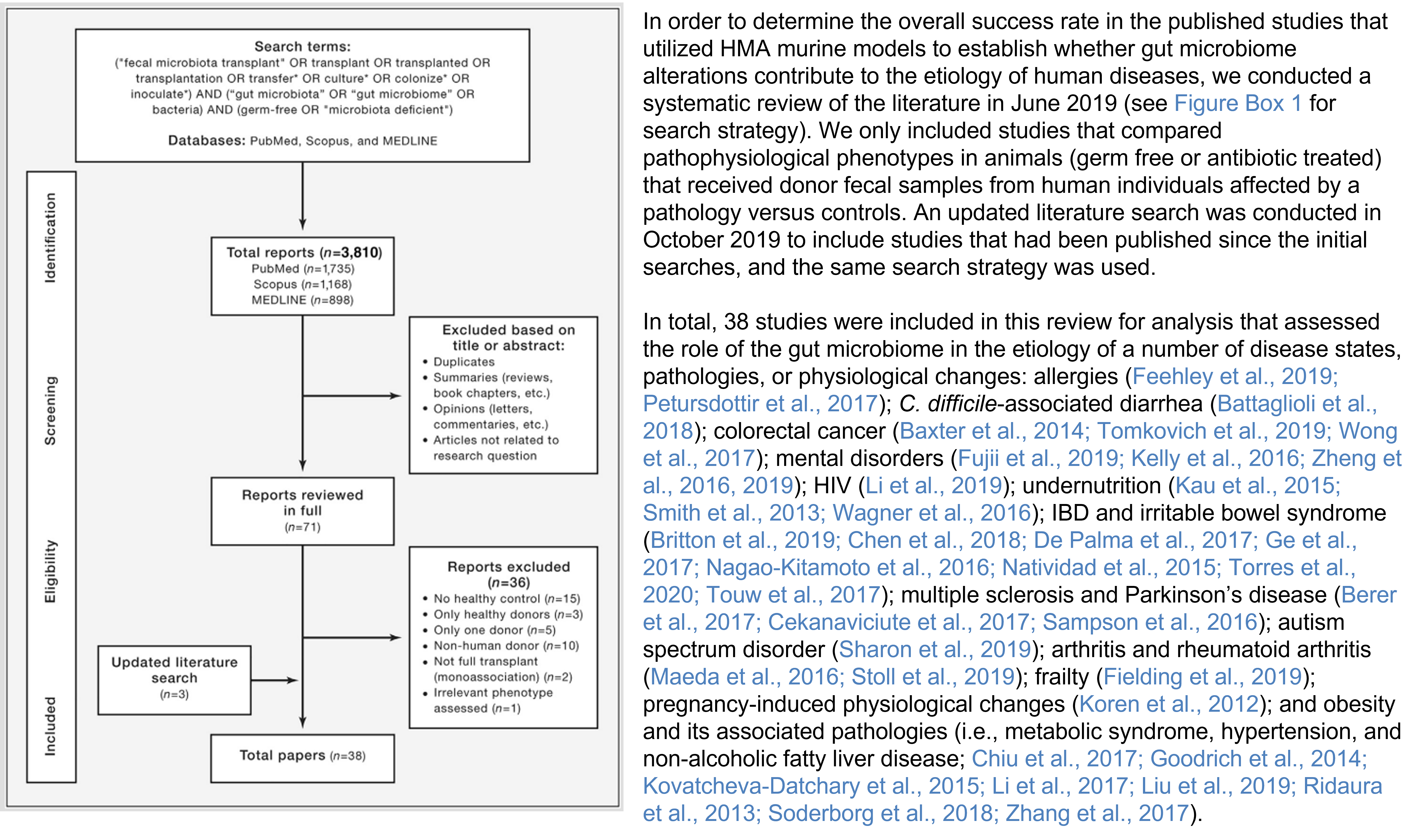 A systematic review of these studies by Walker et al. (Figure 1) revealed that, out of 38 eligible studies that met their criteria, 36 reported that transferring gut microbiome from diseased humans into germ-free rodents led to at least one disease-related trait appearing in the animals.