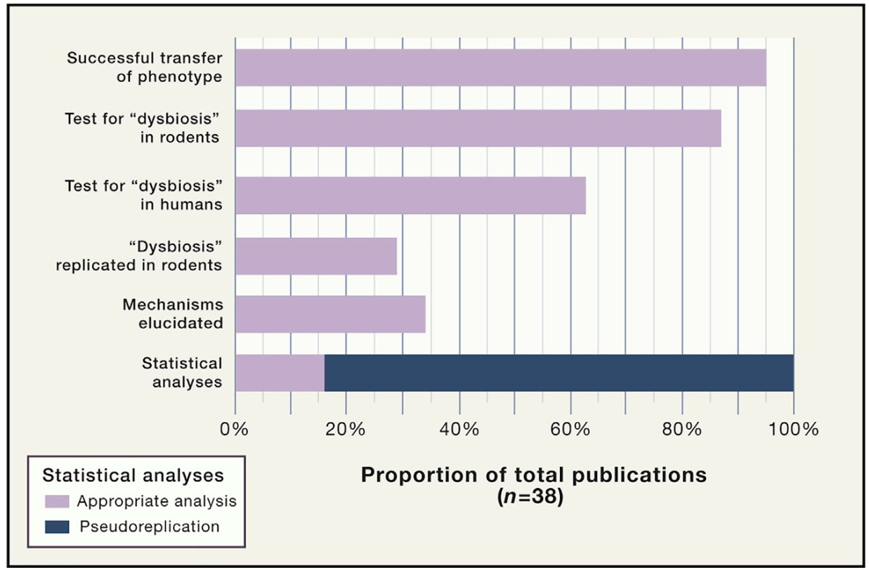 Overall, these methodological problems—pseudoreplication (small numbers of human donors and sample pooling) and limited mechanistic investigation (not confirming dysbiosis and lack of molecular investigation)—exaggerate the positive findings (Figure 2).
